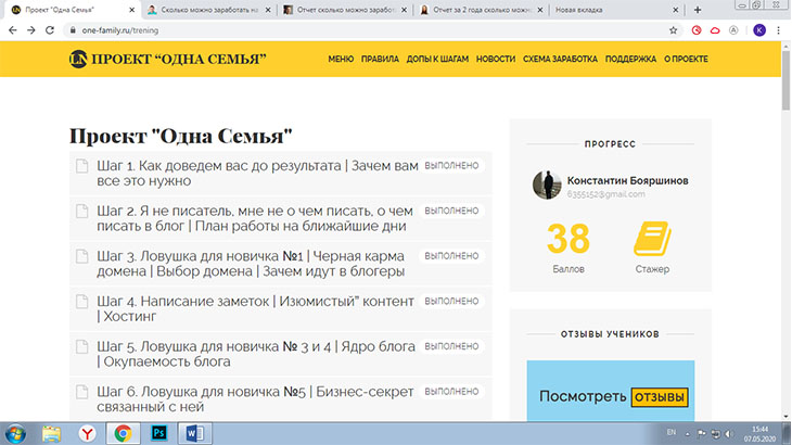 Анонс Пришло время подвести реальные итоги моей деятельности, моего понимания в процессе обучения Одна семья. В этой статье опишу, что может дать данный проект людям, пришедшим сюда, как необходимо воспринимать и работать, для достижения цели, ради которой мы что-либо предпринимаем. Введение На момент написания статьи подошел к 60 шагу обучения, уже имеется почти полное понимание сути обучения и анализируя все пройденные этапы, могу с уверенностью объяснить, что представляет проект "одна семья" до уровня 60-го шага обучения. Чем я сейчас и займусь, стараясь донести все что понял и не понял, прошел и предстоит пройти в этом тренинге и моем развитии на поприще интернет блогинга. В проекте преподносят, что их цель является, помочь людям любого возраста и социального статуса овладеть озами работы в ... Читать дальше » Прикрепления: