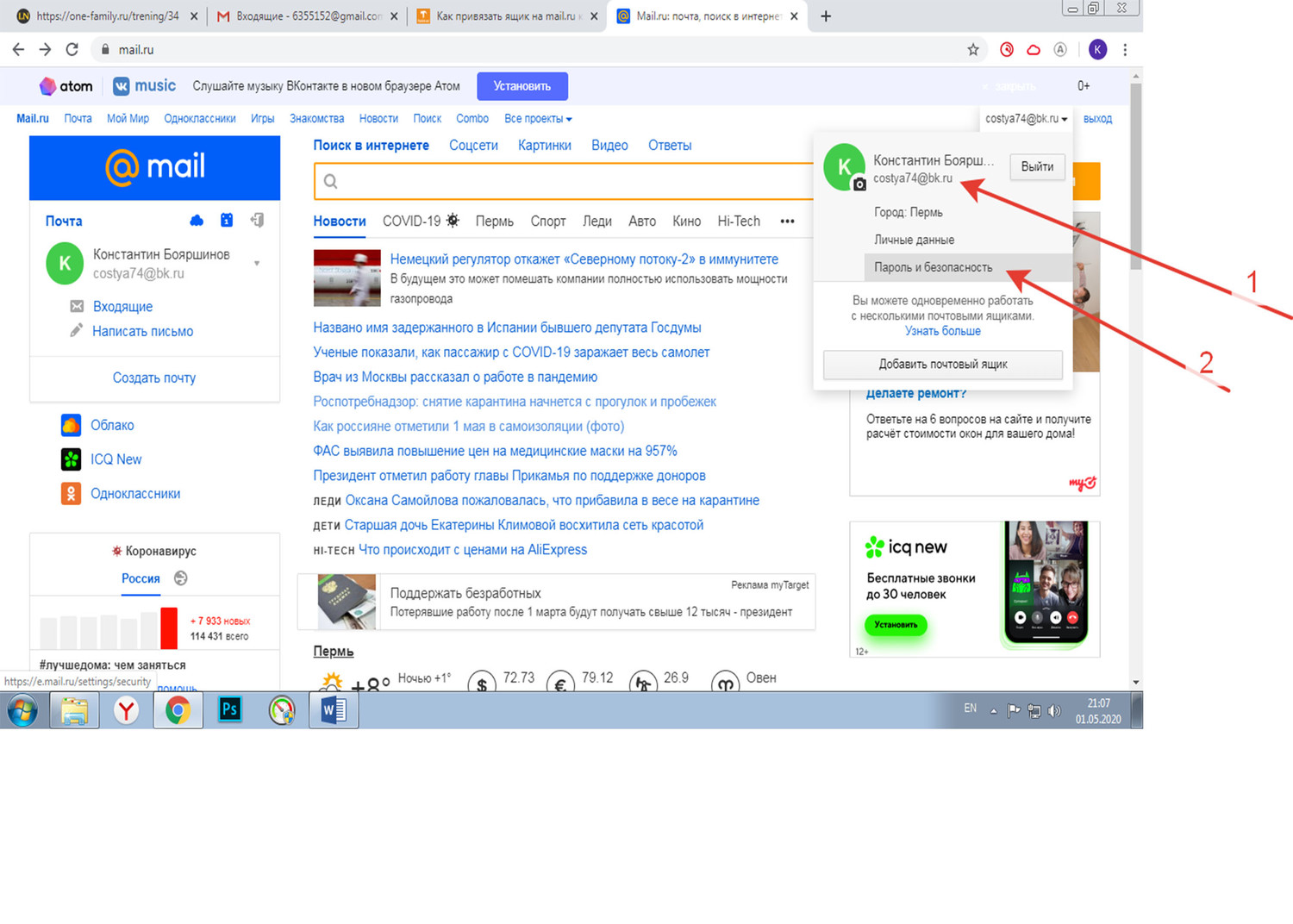 Первым шагом необходимо зайти на свой имеющийся аккаунт и нажать в правом верхнем углу, около вашего имени стрелку (1).